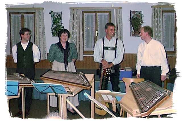 | Aber noch mehr: bei einem gemütlichen Abend im Gasthof Alter Wirt in Rosenheim-Aising hat in einer öffentlichen Veranstaltung am 07. Oktober 2002 das Rosenheimer Zithertrio die Landler, Walzer, Mazurka, Polka-Mazurka, Schottisch und Polka für ein aufmerksames und begeisterungsfähiges Publikum hörbar gemacht. Das Ensemble (s. Bild von links nach rechts) mit Andreas Osterhammer aus Frasdorf, Sabine Riemer und Martin Prochazka (Kontragitarre) aus Fischbachau sowie Helmut Scholz aus Rosenheim ließ abwechlungsreiche Sätze in eigenem musikalischen Ausdruck erklingen. | |||||||||||||||||