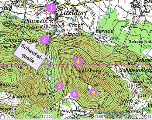 Wir beginnen den Anstieg bei der Kirche (1) in Litzldorf und folgen den Wegweisern zum Sulzberg. Am Hinweis zur Schwefelquelle (2) vorbei, führt uns der schmale Weg zum oberen Litzldorfer Wasserbehälter. Am Talende (3) zweigen wir nach links ab und steigen den Pfad hinaus zum Westrücken (5). Nun den Rücken hinauf bis zum Gipfel (5). Den Abstieg treten wir nach SW an, steil bergab zu den Almwiesen der Schlipfgrub (6) und weiter durch den Bergwald hinunter zur Schwefelquelle. Nach ausgiebiger Wellness an der Quelle, treten wir den Rückweg nach Litzldorf an, zweigen auf halben Weg nach links ab hinunter zum Wasserfall. Den Bach folgend kommen wir zum Zementwerk, einem Industriedenkmal aus dem 19. Jahrhundert. Nun zurück ins Dorf, wo uns die Wirtsleute Lisi & Hans vom Gasthof Höss zu einer gemütlichen Einkehr erwarten. |